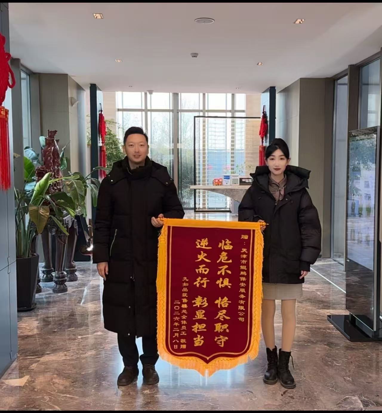 近日,天津市鲲鹏保安服务有限公司驻保税区某高端售楼处项目收到客户单位专程赠送的锦旗,鲜红锦旗上“临危不惧恪尽职守;逆火而行彰显担当”的烫金大字,是对鲲鹏保安团队快速响应、科学处置高压线火情的褒奖。此次火情因高压线打火引燃地面干草引发,火势紧邻高压线路,险情一触即发。鲲鹏保安队员凭借敏锐警觉、专业素养与协同,成功将火情扼杀在萌芽阶段,避免了重大安全事故与财产损失,获得属地消防部门高度赞扬与客户单位充...